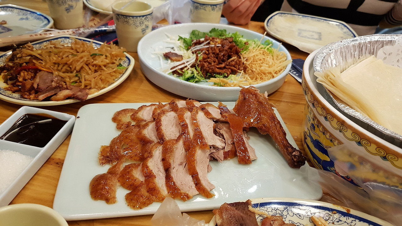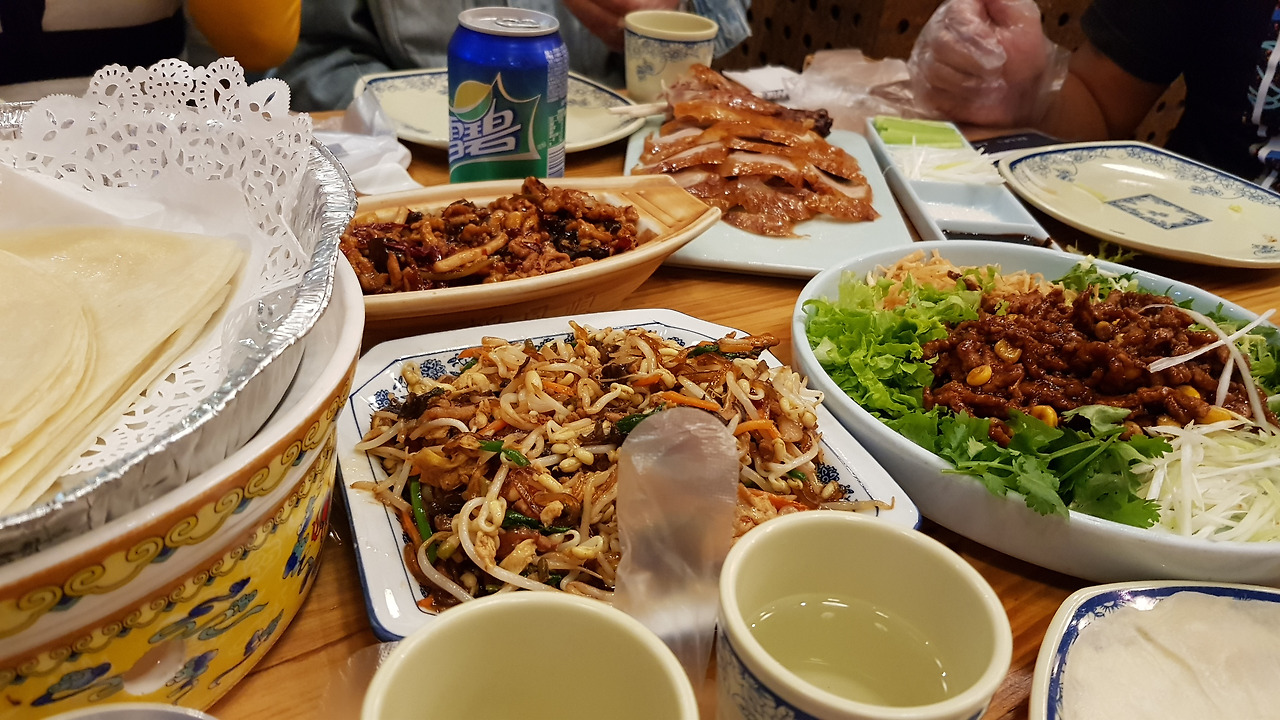 밀가루를 반죽해 얇게 편 하얀 전병에 북경오리를 비롯한 주문한 요리를 넣고 장을 발라 돌돌 말아 먹으면 된다.