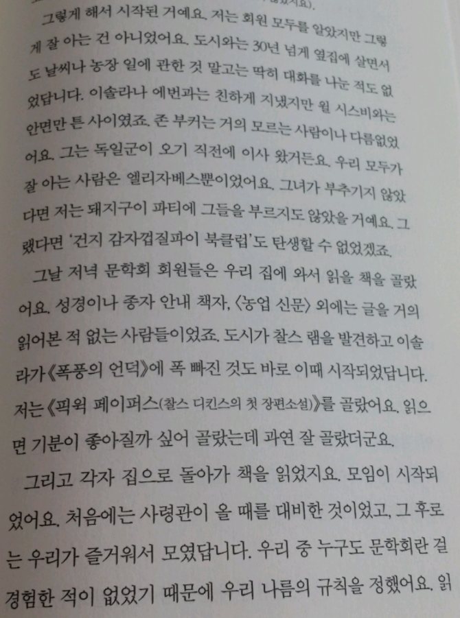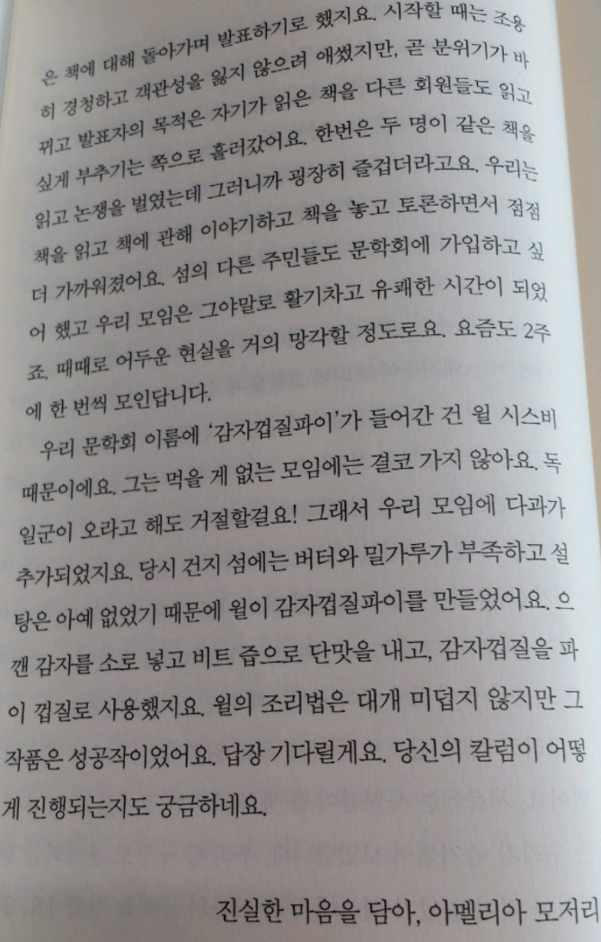 제2차 세계대전 당시 독일군에 점령됐던 영국의 건지 섬 사람들이 그 살벌한 점령군 치하에서도 책을 읽고 토론하는 북클럽을 통해 삶에 대한 희망을 계속 이어갔던 이야기를 서간문 형식으로 다룬 소설.