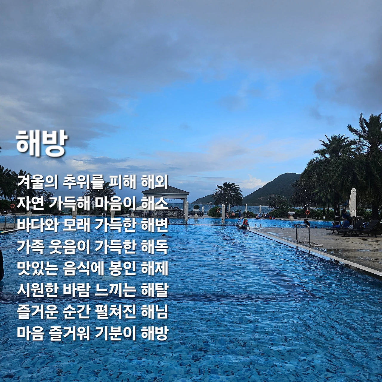 겨울의 추위를 피해 따뜻한 날씨의 해외로 떠났다. 계속되는 흐린날씨와 비 소식에도 불구하고 자연 가득한 이곳에서 마음이 해소되는 기분이었다. 푸른 바다와 부드러운 모래 기득한 해변에 발을 담궜다.가족과 함께하는 이 시간은 웃음소리로 가득 차, 서로의 마음을 더욱 따뜻하게 해주었다. 해독되는 느낌이랄까?