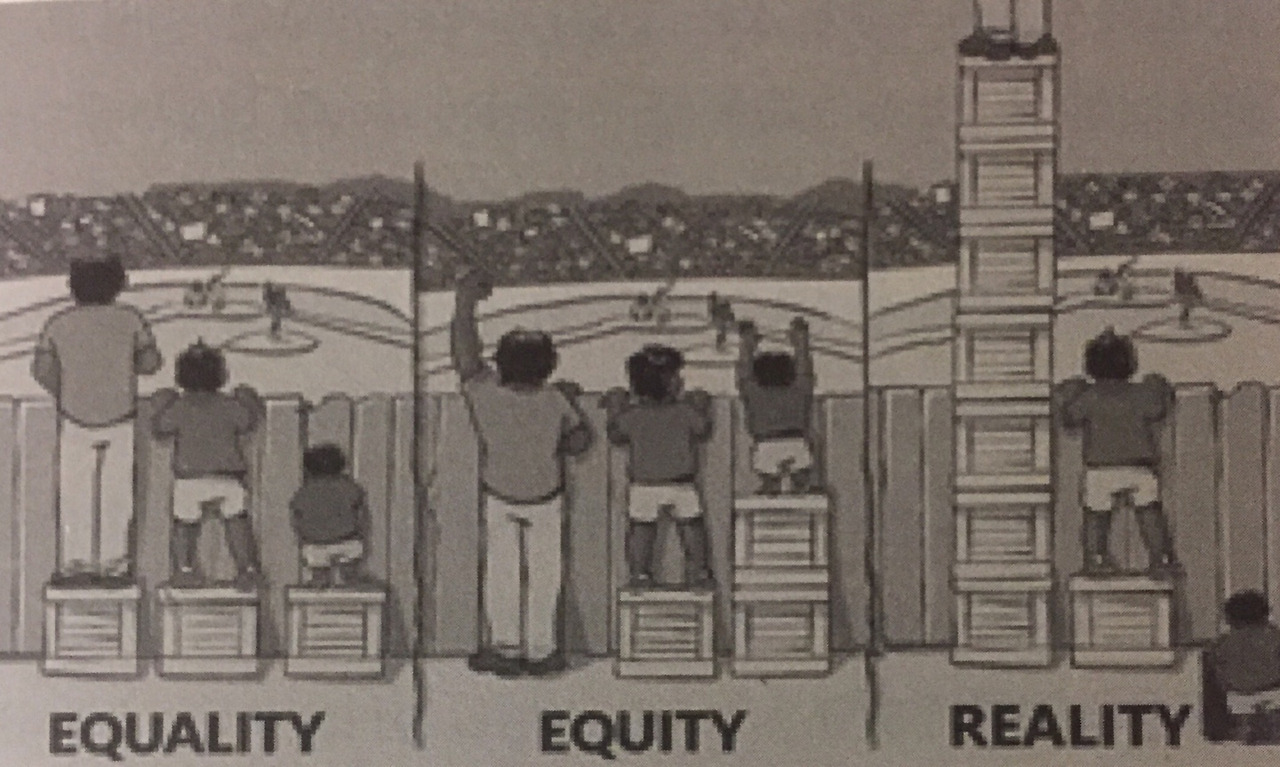 세 아이가 세 가지 상황에 놓여 있다. 우선 가장 오른쪽 그림은 원래 주어진 현실(reality)이다. 현실은 누군가는 비빌 언덕조차 없고, 누군가는 적당히 살 만하고, 누군가는 기반이 차고 넘친다. 이것은 초기 조건의 차이다. 초기 조건인 부모의 사회경제적 수준과 배경에 의해, 어느 정도 적당한 경제력을 가진 부모의 아이는 발판 하나일지라도 깔고서 야구 경기를 관람하고, 부모의 경제력이 월등한 데다 키마저 큰 아이는 오히려 발판을 7개나 깔고 서서 멀리까지 잘 볼 수 있는 위치에서 시원하게 야구 경기를 관람하고 있다. 반면 부모가 경제력이 없거나 재산을 전혀 상속받지 못한, 발판이 전혀 없는 키 작은 아이는 여전히 야구 경기를 관람하지 못하고 있다. 안타깝다.