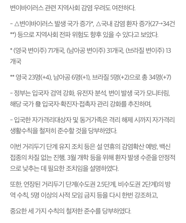 (보건복지부 현황 보도에 의하면) 현재 국내에서 세 가지 변이 바이러스에 걸린 사람은 34명이란다.