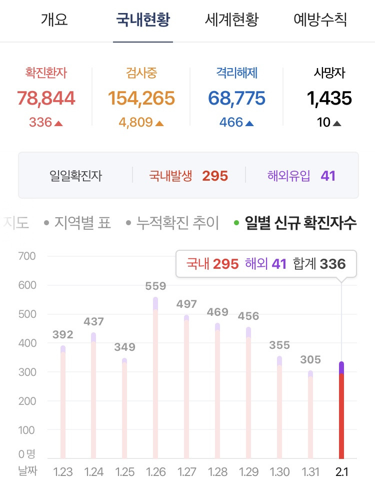 코로나 19 확진자 수 336명.