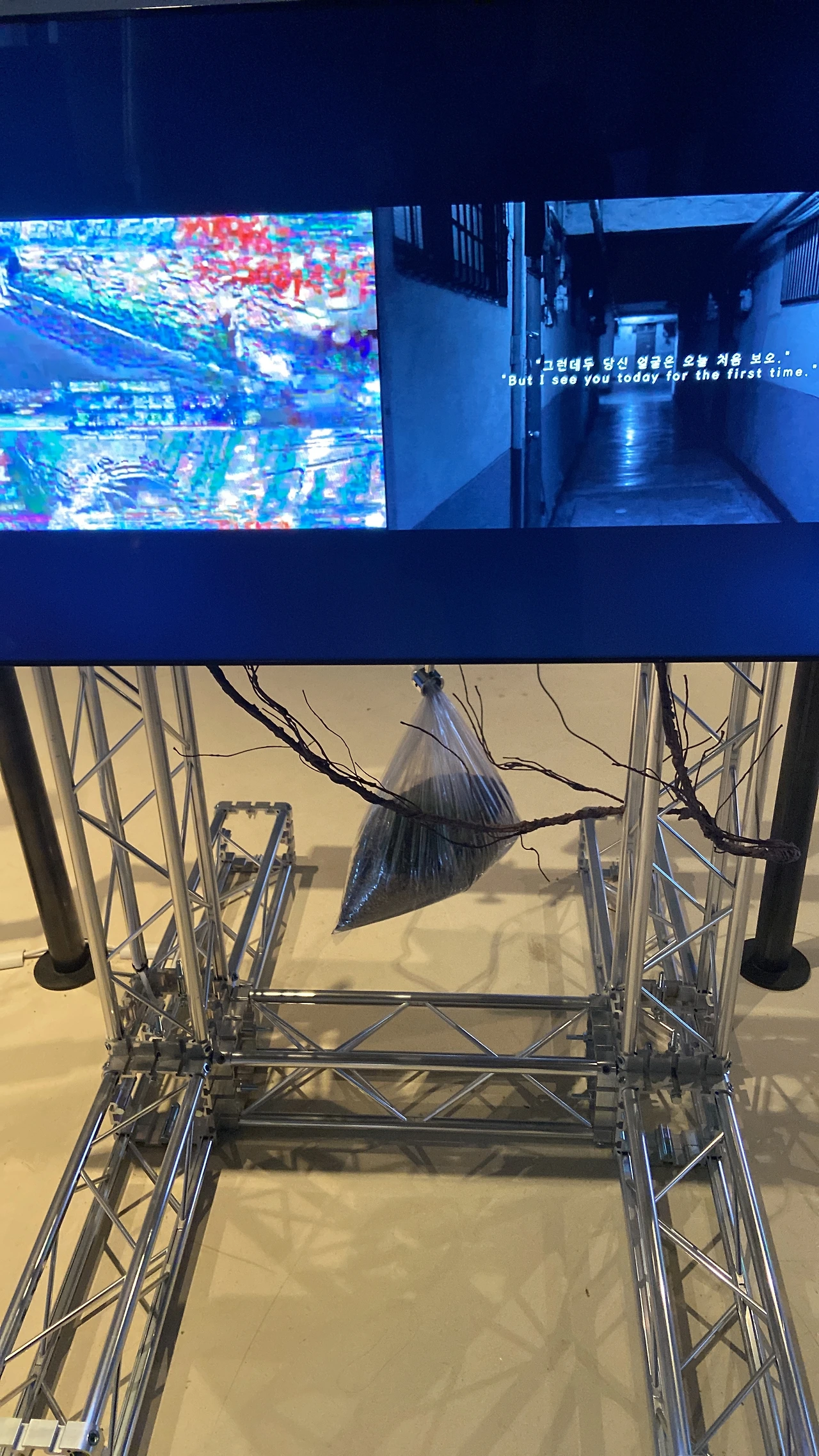 그에 반해 도시의 건물들은 늘 변한다. 김환기도 산 적이 있고, 6.25 때 사진에도 찍힌 적이 있다는 우리나라 최초의 아파트, 녹색의 충정아파트는 곧 사라질 것이다. 건물 내의 사운드와 건물 내의 흙과 같은 지물들을 같이 배치해 두었다.
