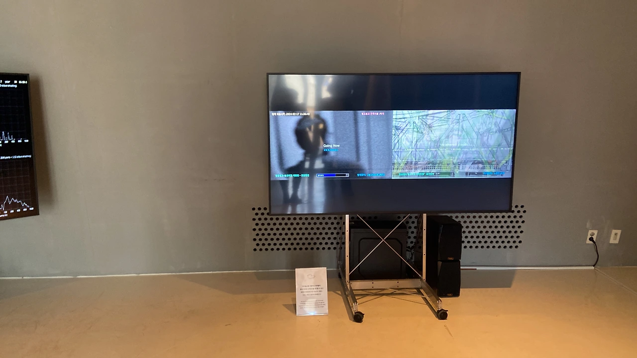 이전에 어느 역에서인가 관찰한 사진들과 실시간 데이터를 연동해 현재의 지하철이 어디에 있는지 숫자로 확인할 수 있다. 앞쪽에는 지하철이 덜컹이는 느낌의 의자를 만들어 두었다.