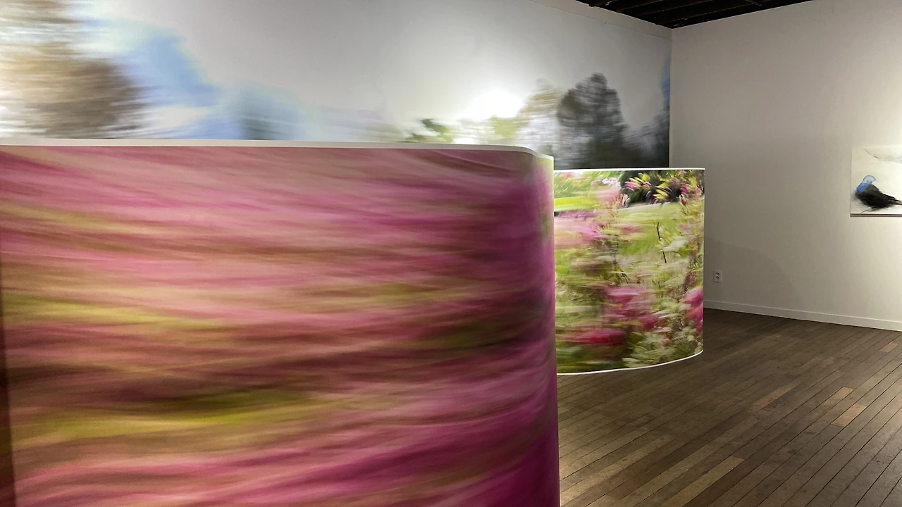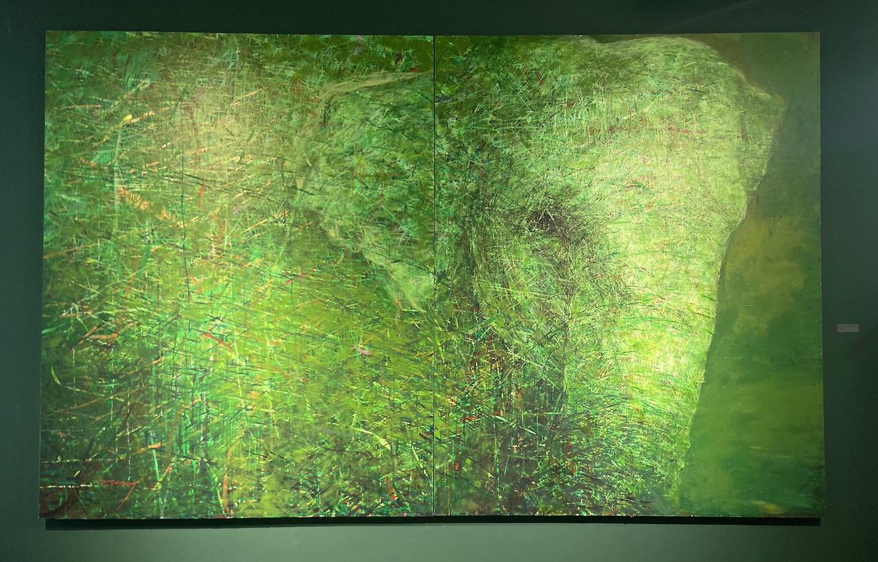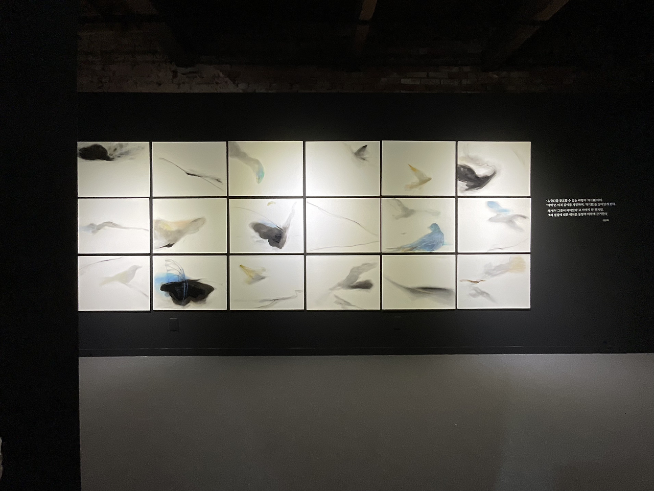 전시장에는 코가 없는 덩치 큰 흰 코끼리가 한 구석을 차지하며 서 있고, 자유로운 선의 분명하지 않은 초록빛 스케치들이 드문 드문. 한 방을 지나면 거대한 숲 빛 코끼리가 있다. 색에 빠져 든다. 아크릴과 오일스틱을 같이 썼다고 했다. 캔버스 세폭으로 코끼리의 거대함이 살아났다. 수많은 선들을 겹치고 겹쳐 내니 코끼리가 숲이 되었다. 한 녀석은 크게 동요하지 않는 표정이라고 나는 느꼈다. 뒤돌아서면 왠지 모를 슬픈 눈의 코끼리가 또 함께 있다. 코끼리에서 눈을 떼지 못하다가 다시 시선을 돌리면 흔들리는 맑은 물. 그리고 흔들리는 꽃과 바람의 풍경. 다시 안으로 들어서 볼까. 온통 흔들리는 풍경들이다. 어지럽다는 생각이 들지는 않는다. 꽃밭이니까. 밤의 풍경이니까. 흐릿한 풍경을 건너, 흰 여백과 들리지 않는 속삭임, 나는 듯한 선들이 바람처럼 흩어지는 마지막 방을 만난다.