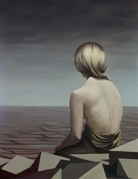 반쯤 흘러내린 옷, 혹은 입다가 만 옷일까. 축 쳐진 어깨에 망연자실한 뒷모습의 그녀는 그 끝을 알 수 없고 풀 한 포기 없는 땅을 바라보고 있다. 땅은 메말라 갈라져 있는 걸까. 일정하지 않은 땅의 구성들이 복잡하다. 그림을 기대하며 맞춰가지만 거의 다 맞춰가는데도 아무런 그림이 나오지 않는, 마치 삐뚤빼뚤한 퍼즐 같기도 하다. 저 앞에 보이는 다른 땅들과는 다른 색을 한 부분은 혹시 물일까? 짙은 회색빛의 하늘은 땅끝으로 가면서 그나마 밝아진다. 새벽녁쯤일지도 모르겠다.