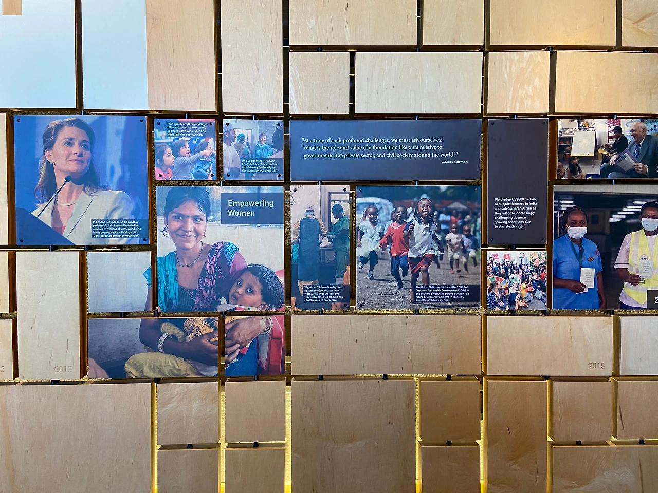 2023년 2월 당시 ‘Reflections’ 라는 전시가 진행 중이었습니다. 이 전시는 시애틀 지역에서 활동하는 여섯 명의 예술가들의 작품으로, 게이츠 재단의 디스커버리 센터에서 위탁 기획한 특별전시입니다. 지난 20년간 게이츠 재단이파트너들과 함께 했던 프로젝트들을 시각예술로 해석한 작품 20여 점이 전시되어 있었고, 이 작품들은 게이츠 재단이 진행하는 네 가지 주제로 구성되어있었습니다.