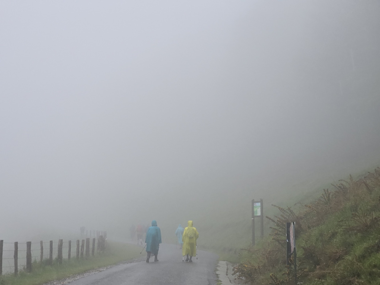피레네산맥은 생장에서 출발해서 순례자가 넘는 첫 관문으로 넘는 언덕의 높이가 약 1,430m 정도가 된다. 이 산맥을 넘으면 자연스럽게 프랑스를 지나 스페인 국경을 넘게 되는데 그 길에 울창한 숲과 푸른 초원, 바위 능선이 조화를 이루는데 아름답기로 유명하다. 그리고 넓은 초원과 산 위의 목장에 평화롭게 양과 소들이 풀을 뜯어먹는 모습을 오랫동안 꿈꿔왔다. 출발 전날 비 예보가 있어 새벽에 일어나자마자 혹시나 하는 마음에 밖으로 나가봤다. 정말 부슬부슬 비가 내리고 있었고 앞을 가리는 안개가 자욱했다.