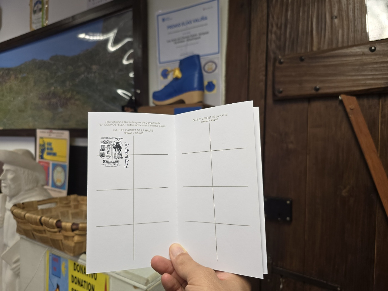 “지금까지 50년을 살아왔고 앞으로 다시 50년을 살아야 하는데 이 길을 걷고 새로운 인생을 살고 싶어서 왔다.” 고 대답을 했다. 그녀가 환하게 웃으며 “부엔 까미노”라고 인사를 해주는데 나의 산티아고 길 여행을 진심으로 응원하는 마음이 느껴졌다. ‘부엔 까미노’는 산티아고길 인사말로 Buen (좋은) Camino (길) 이었다. 간단히 인터뷰를 마치고 떨리는 마음으로 순례자 여권을 받아 들고, 첫 도장을 꾹 찍었다.