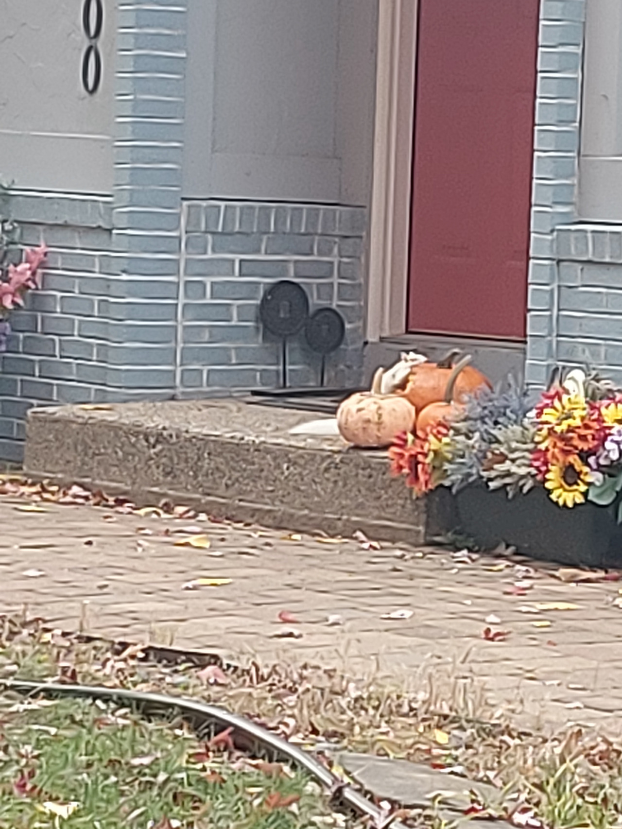 대문 앞의 호박 덩어리가 빵빵하니 고왔던 얼굴을 잃어갑니다. 다람쥐 때문이지요. 팔뚝만한 녀석들이 종일 오르락 내리락, 밤낮없이 파먹습니다. 엊그제 집에 들어오는 길에 딱 걸린 하얀 다람쥐...! 조금 멀어 사진이 흐릿한데, 그래도 한창 작업 중인 모습을 잡았습니다. 보이세요? 아예 편안히 올라앉아 식사중인 모습.. 바닥에 편안히 깔아놓은 복실한 꼬리. 저희집 애들은 사람을 봐도 도망을 안갑니다. (혹시 몸이 무거워서..?)