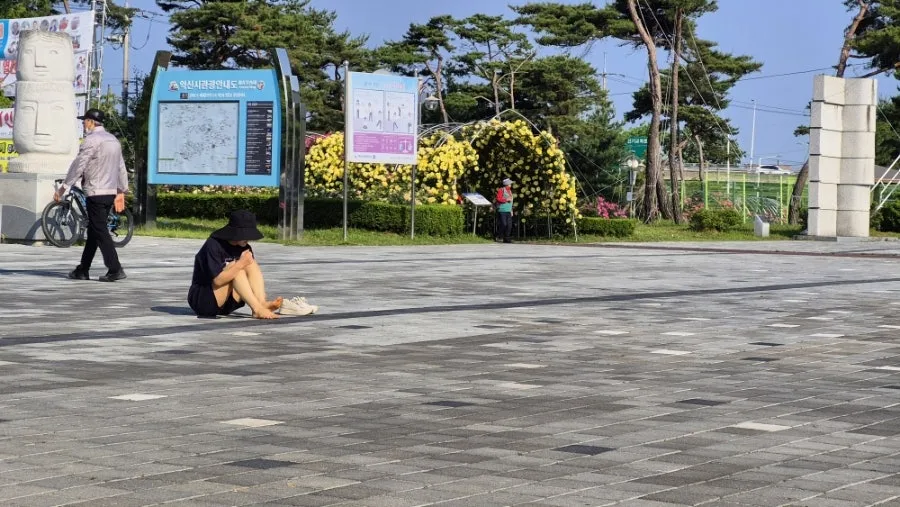 발을 닦는 곳에서 차가운 물로 시원하게 발을 닦은 후 햇빛이 단단하게 내려오는 곳에 앉아 발을 말렸다.