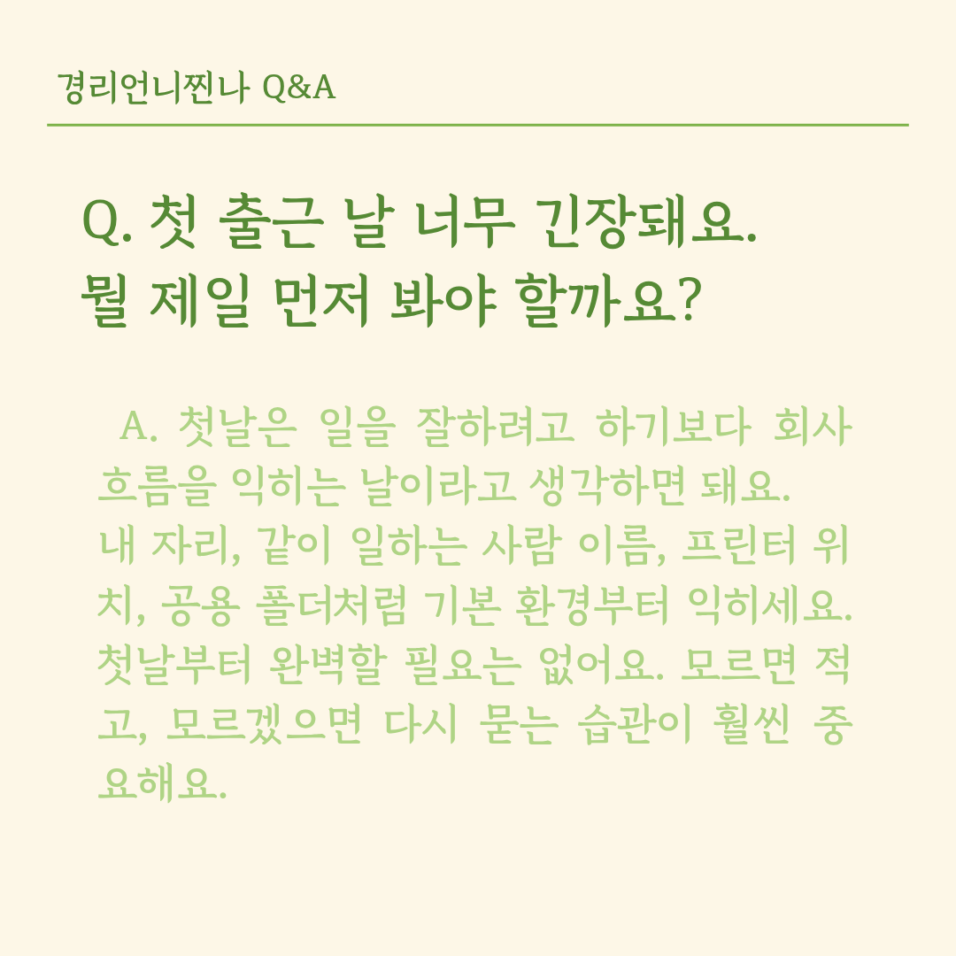 첫 출근 날은 업무를 잘하는 것보다 자리와 흐름을 익히는 것이 먼저입니다.