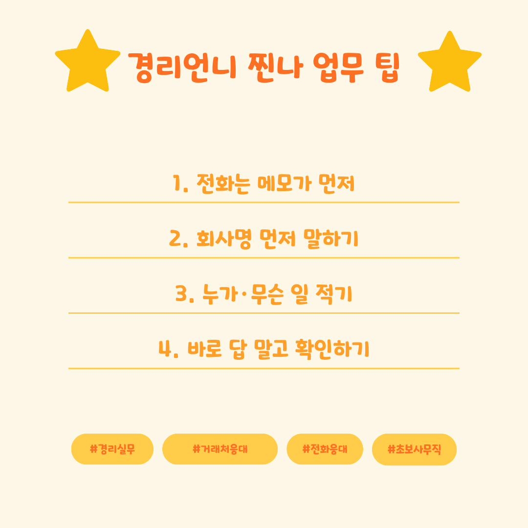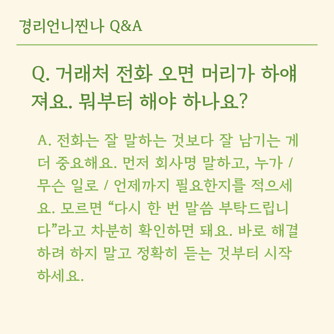 받고, 회사명 말하고, 누구인지 듣고, 무슨 일인지 적으면 돼요. 다 해결하려고 하지 말고, 정확히 듣는 게 먼저예요.