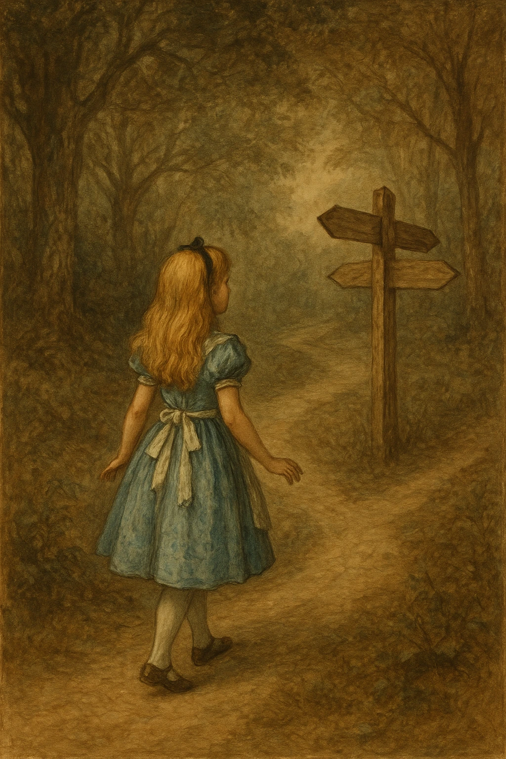 갈림길에 다다른 앨리스. 축 처진 어깨너머로 슬며시 모습을 드러낸 현실이 말을 건넵니다.