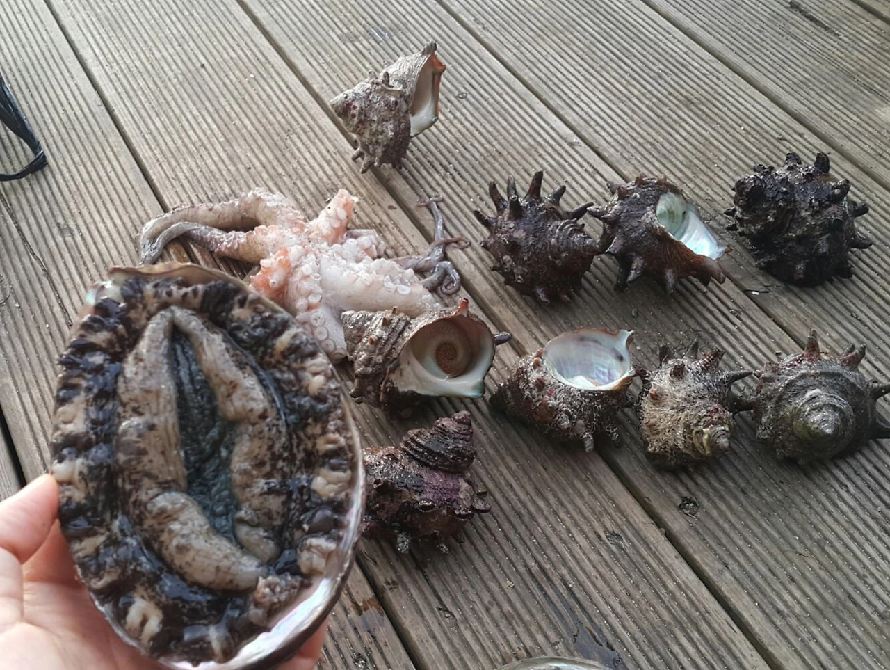 아아들과 잡았던 새끼 광어. 귀엽고 신기해.. 살려줬어요. / 바다를 몇시간씩 헤엄치며 잡은 전복, 소라, 문어.