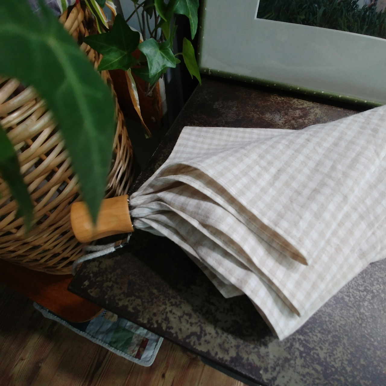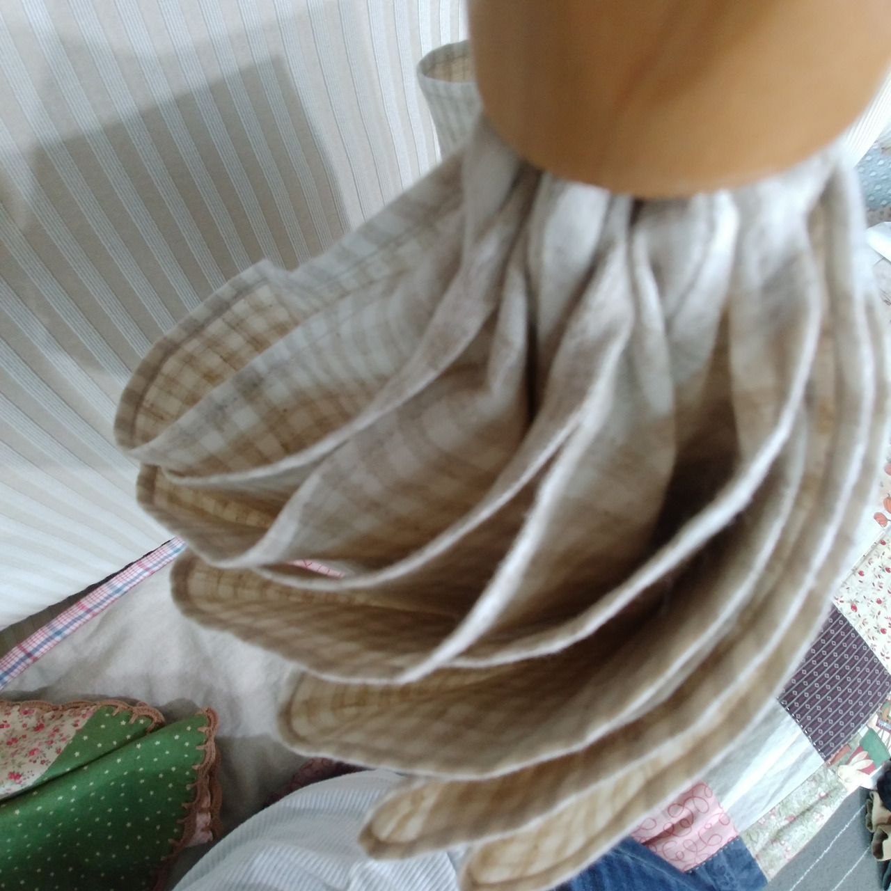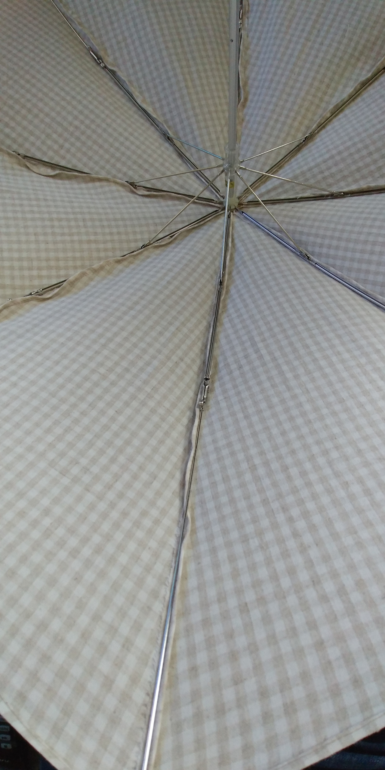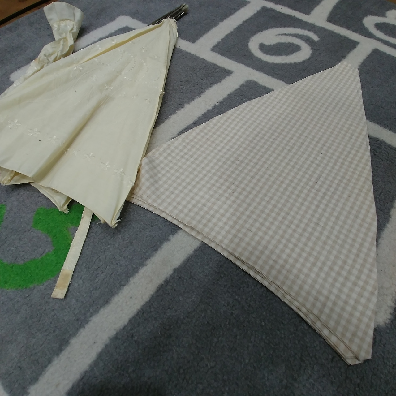 먼저 양산의 천과 살을 분리했다. 어쩜 이렇게 꼼꼼하게 바느질되어 있는지 분리하는 데 오십 번 정도 실을 잘라야만 했다. 그렇게 분리 성공! 분리한 양산의 천을 패턴 삼아 내가 좋아하는 체크 리넨을 재단하고 바느질 했다. '어머머~~~ 예쁠 것 같아.' 혼자 신나서 기분이 마구마구 좋아졌다. 하지만 아직 갈 길이 멀다.