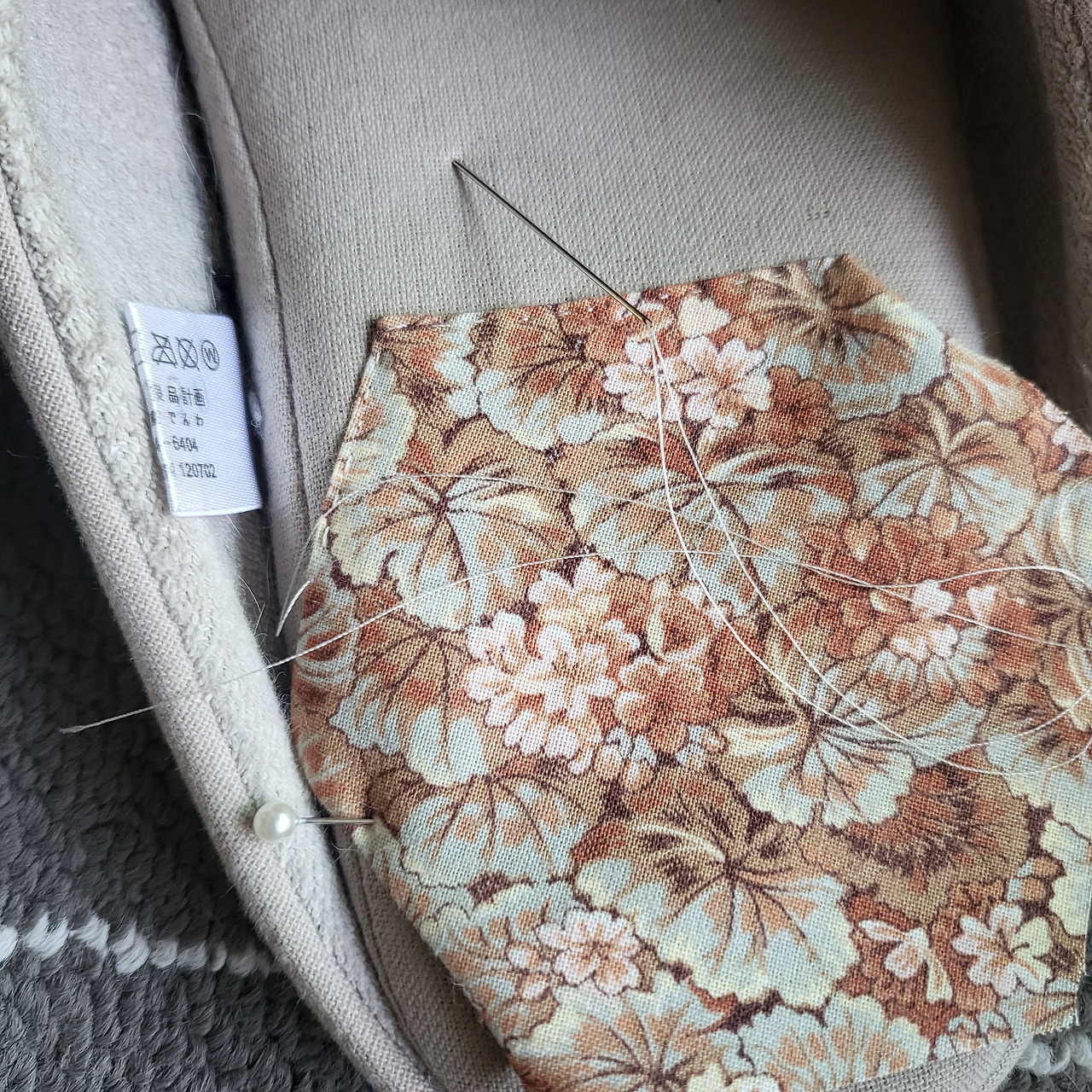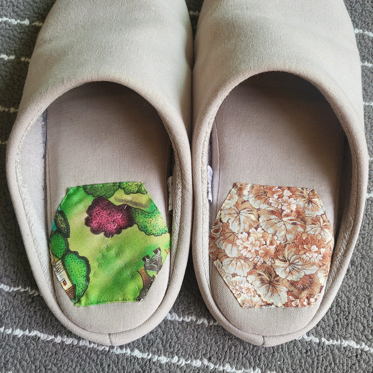 집으로 돌아와 버려질 뻔했던 실내화를 천천히 살펴본다. 어떻게 생명을 불어넣을까 고민한다. 다닝기법으로 다양한 실을 사용할까, 면실로 모티브를 떠서 꿰매줄까. 몇 가지 아이디어가 있었지만 가장 간편한 방법을 취하기로 한다. 작정하고 원단 서랍을 열어 알맞은 원단을 골랐다. 처음엔 쓸모를 찾아주겠다고 모아놓은 아주 작은 자투리 원단을 이어 해진 부분을 덧대주려고 했으나 발꿈치에 닿는 면이 불편할 것도 같고 시간도 너무 오래 걸릴 것 같아 육각형으로 재단해 놓은 원단 중에서 골라 쓰기로 한다. 언제 완성할지 모르지만 침대 스프레드는 만들겠다고 재단해 놓은 형형색색의 육각형 원단이다. 그중 아깝지 않을 원단을 골라 대어 보니 제법 어울려 보인다. 시접 부분을 접고 시침핀으로 고정해 가며 천천히 홈질로 꿰매다 보면 흉한 부분이 꽃천을 덧대어져 감쪽같다 못해 오히려 더 예쁘다.