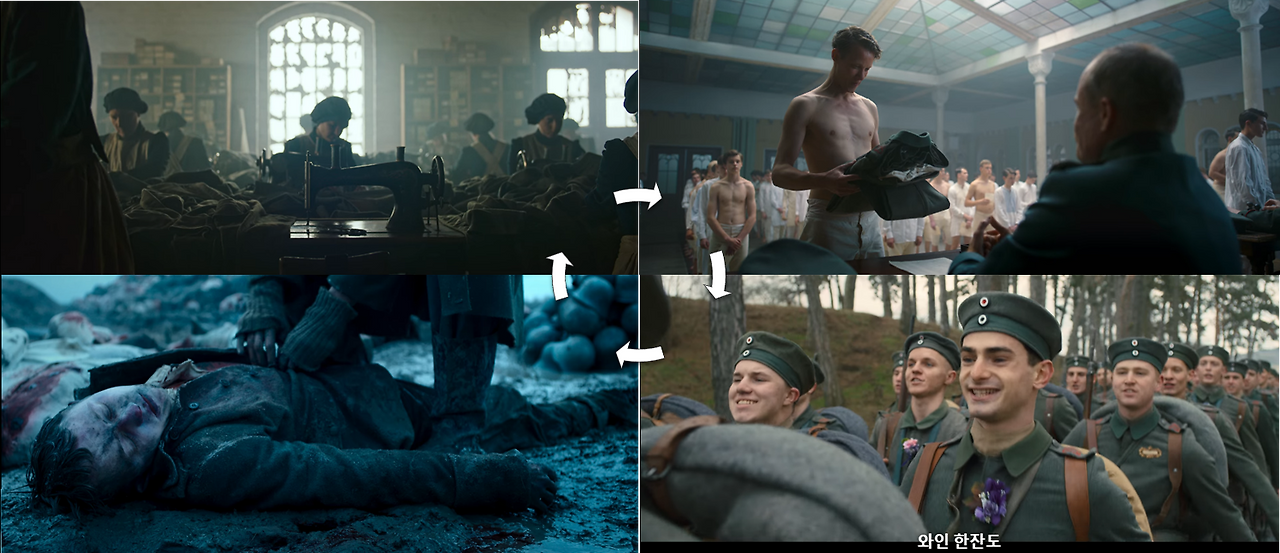 첫 번째 은유는 컨베이어벨트다. 영화는 오프닝부터 이 순환구조를 노골적으로 드러낸다. 전사한 군인의 군복이 수거되고, 기존 명찰이 제거되고, 새로운 병사에게 지급된다. 마치 공장에서 폐기품을 회수해 재가공하는 것처럼 말이다.