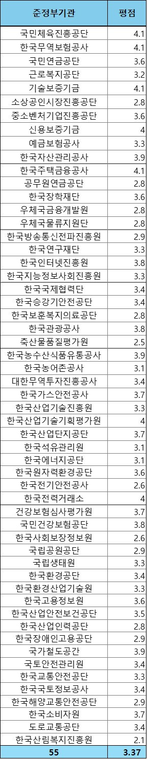 - 준정부기관 : 55곳, 평균 3.37점
