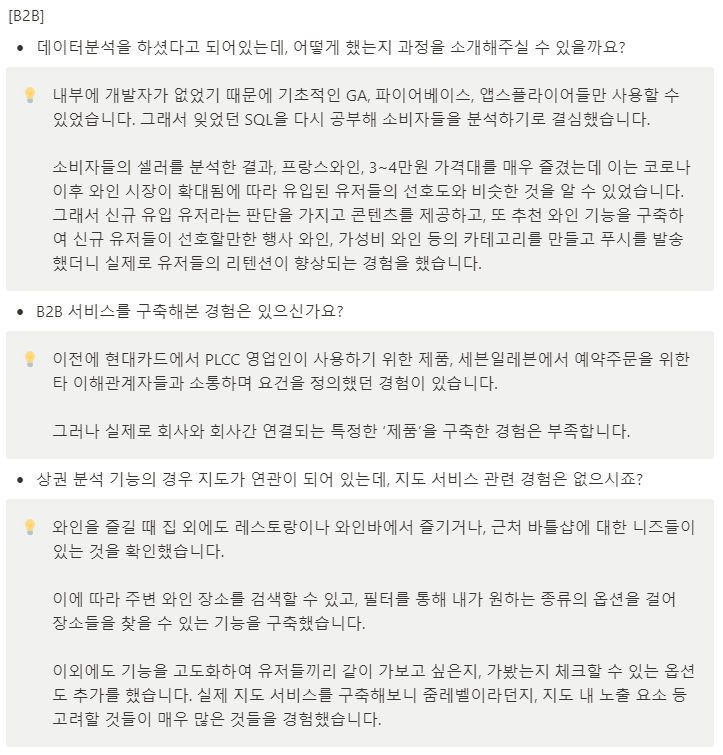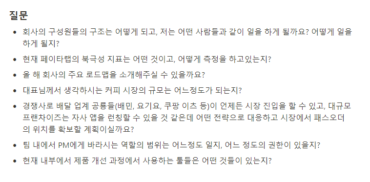 마침 이전에 근무했던 스타트업 입사 면접을 봤을 때, "기획자인데 질문이 너무 없다. 그래서 걱정된다."라는 피드백을 받은 적이 있었다. 이와 같은 일이 재발하지 않도록 이번에는 다양한 질문들을 준비해야겠다고 생각을 했다.