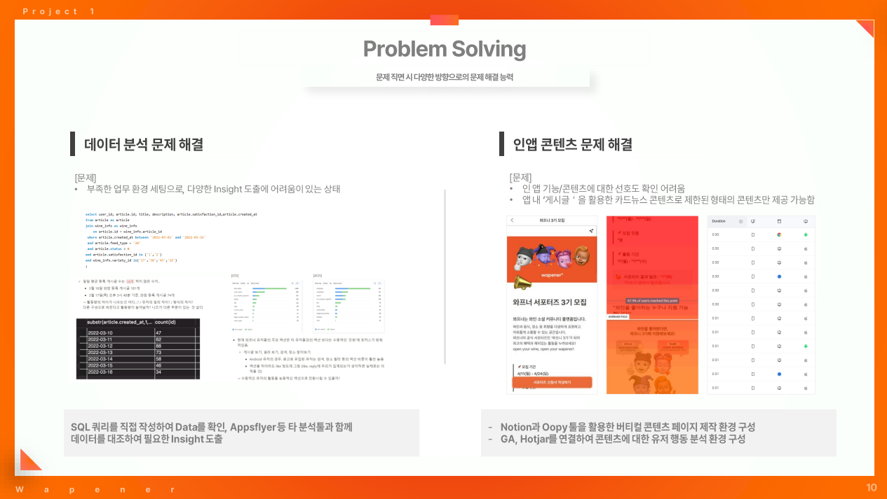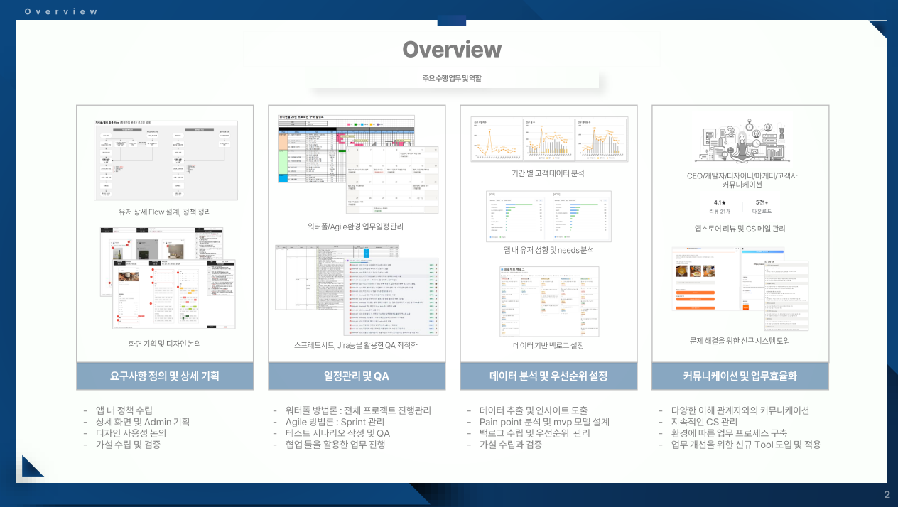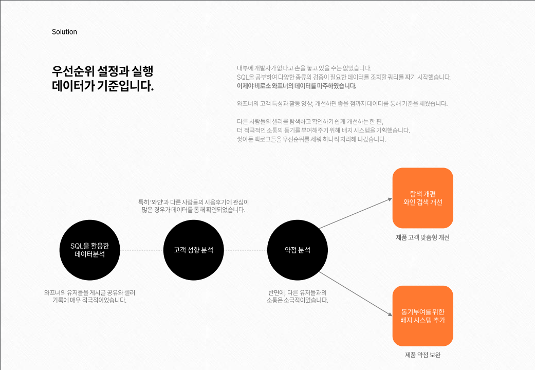 내 A타입 포트폴리오의 문제는 요즘 기업에서 기획자/PM/PO에게 가장 많이 원하는 것들인 "어떤 점이 진짜 문제인지?", "어떻게 해결을 할 것인지?", "여러 해결책 중에서 이걸 선택한 이유는 무엇인지?"와 같은 고민의 과정이 보이지 않는다.라는 의견을 듣고 나는 다른 프로젝트 경험을 빼고 스타트업에서의 문제 인식과 해결 과정만을 집중해보기로 했다. 그렇게 만든 것이 B타입의 포트폴리오였다.