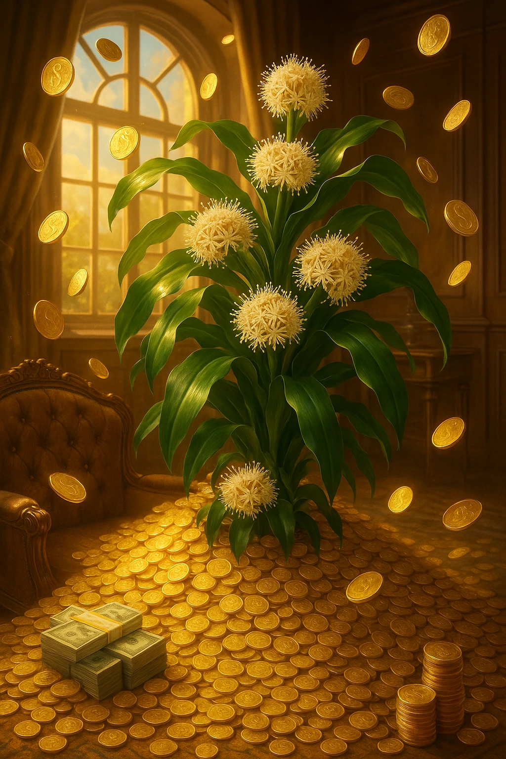 고급스러운 실내 안에서 나무 왕좌에 앉아있고, 주위에는 돈 뭉치, 금화, 골드바, 보석, 다이아몬드, 그리고 명품까지...