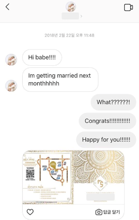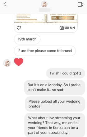 "안녕 Babe, 나 다음달에 결혼해. 시간되면 브루나이 내 결혼식에 와주면 좋겠어."