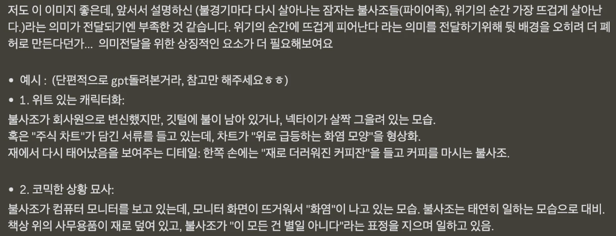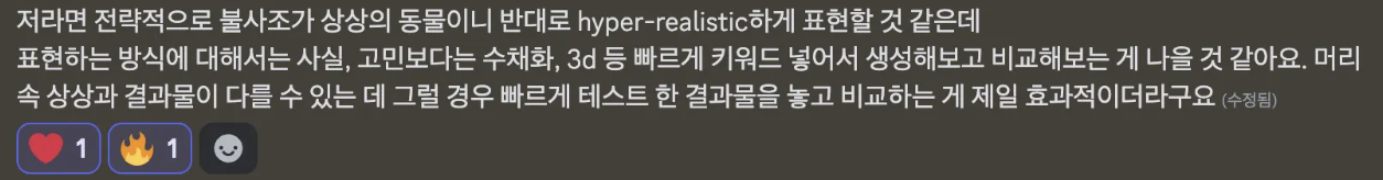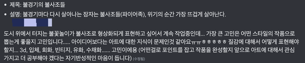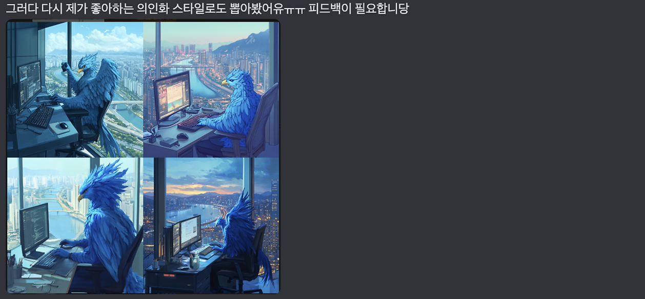 강이 펼쳐진 도시 위에 터지는 불꽃놀이를 불사조로 형상화하는 과정에서 많은 고민이 있었다. 3D, 입체, 회화, 빈티지, 유화, 수채화 등 어떤 스타일로 표현할지 결정하는 것이 가장 어려운 숙제였다. 이 과정에서 예술에 대한 도메인 지식이 부족함을 절실히 느꼈다. 예술 분야 전문가인 팀원분들의 피드백이 강력히 필요한 시점이었다.