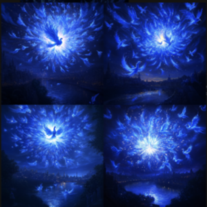 밤하늘에 불꽃놀이로 피어나는 파란색 불새가 한마리가 아니라 여러마리가 불꽃놀이로 터지는 장면