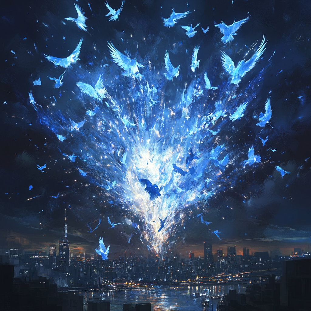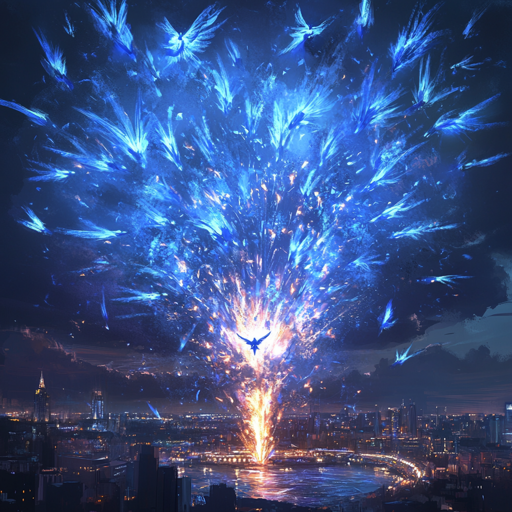 A massive firework explodes in the sky, transforming into about 100 blue phoenixes bursting outward.