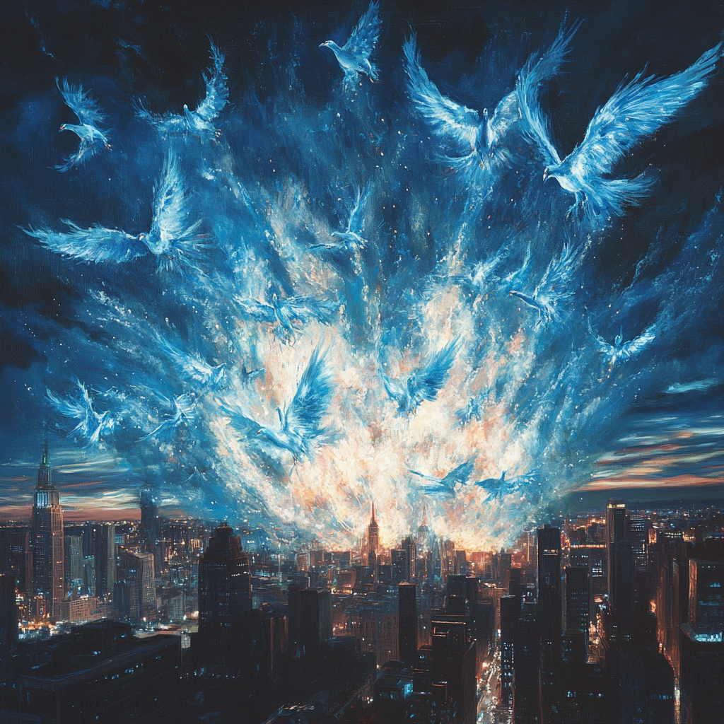 A top-down view from the sky looking toward the ground, where a single massive firework explodes, with 100 sparks transforming into individual blue phoenixes.