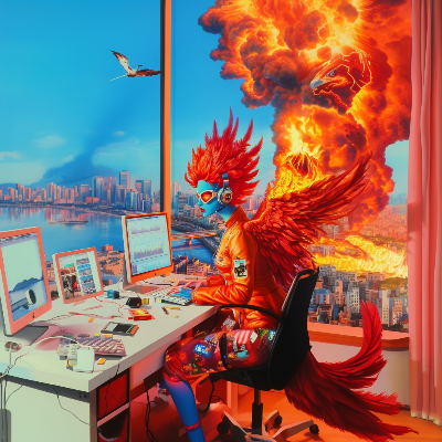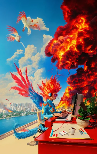 A wide shot photo of a blue phoenix character with wings ablaze in red flames types on a computer keyboard, embodying the FIRE tribe. The phoenix wears MZ style fashion, an apple headset, an apple watch, and the computer screen displays graphs. Through a large window, the expansive view of the Han River in Seoul dominates the backdrop, now transformed into a surreal scene of a volcanic eruption, with fiery lava and smoke billowing into the sky. --sref 159188116
