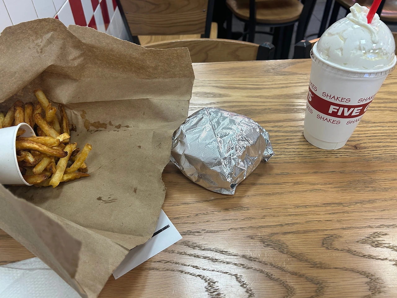 처음 미국을 방문해서 먹은 버거는 파이브 가이즈이다. 세 버거집 중 가격이 제일 비싸다. 세트를 먹으려면 기본으로 20달러가 넘는다. 대신 파이브 가이즈의 버거와 함께 제공되는 감자튀김의 양이 상당히 많고 짭짤하다. 개인적인 생각으로는, 감자튀김이 가장 맛있는 건 파이브가이즈 라고 생각한다.