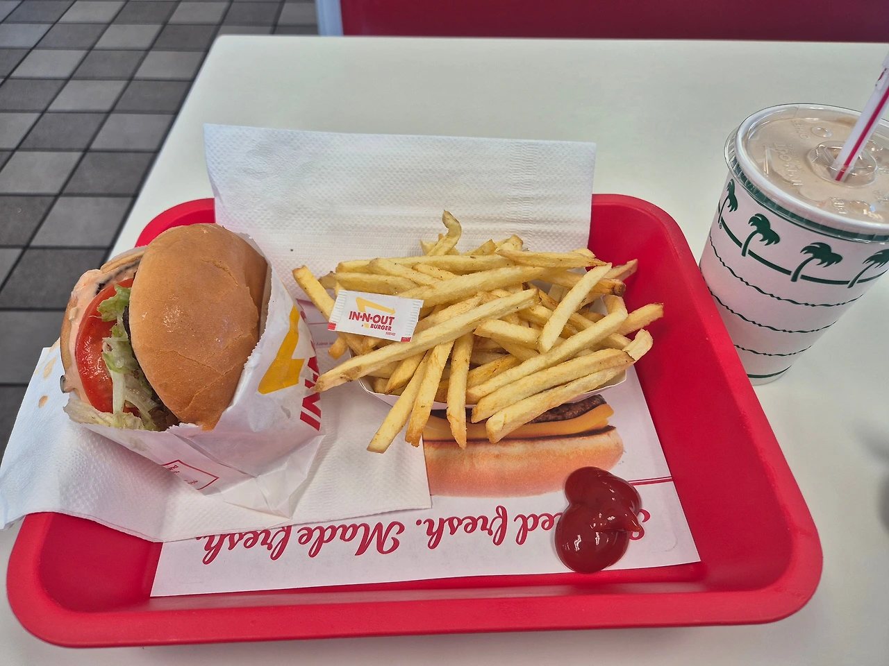 인앤아웃의 특징은, 따로 뿌려먹는 소금을 주는 감자튀김과, 달고 진한 쉐이크이다. 버거는 비교적 평범한 버거이다.