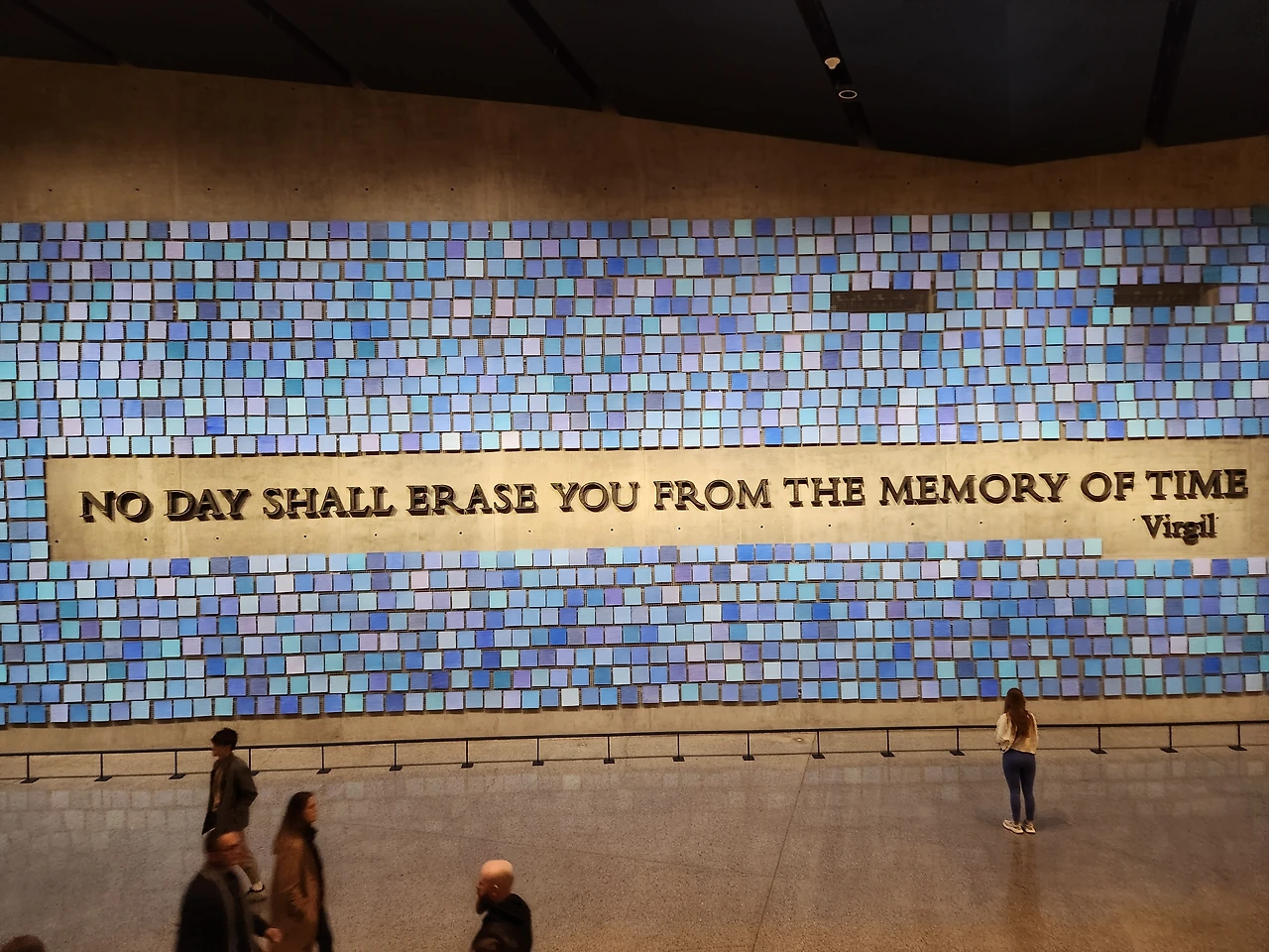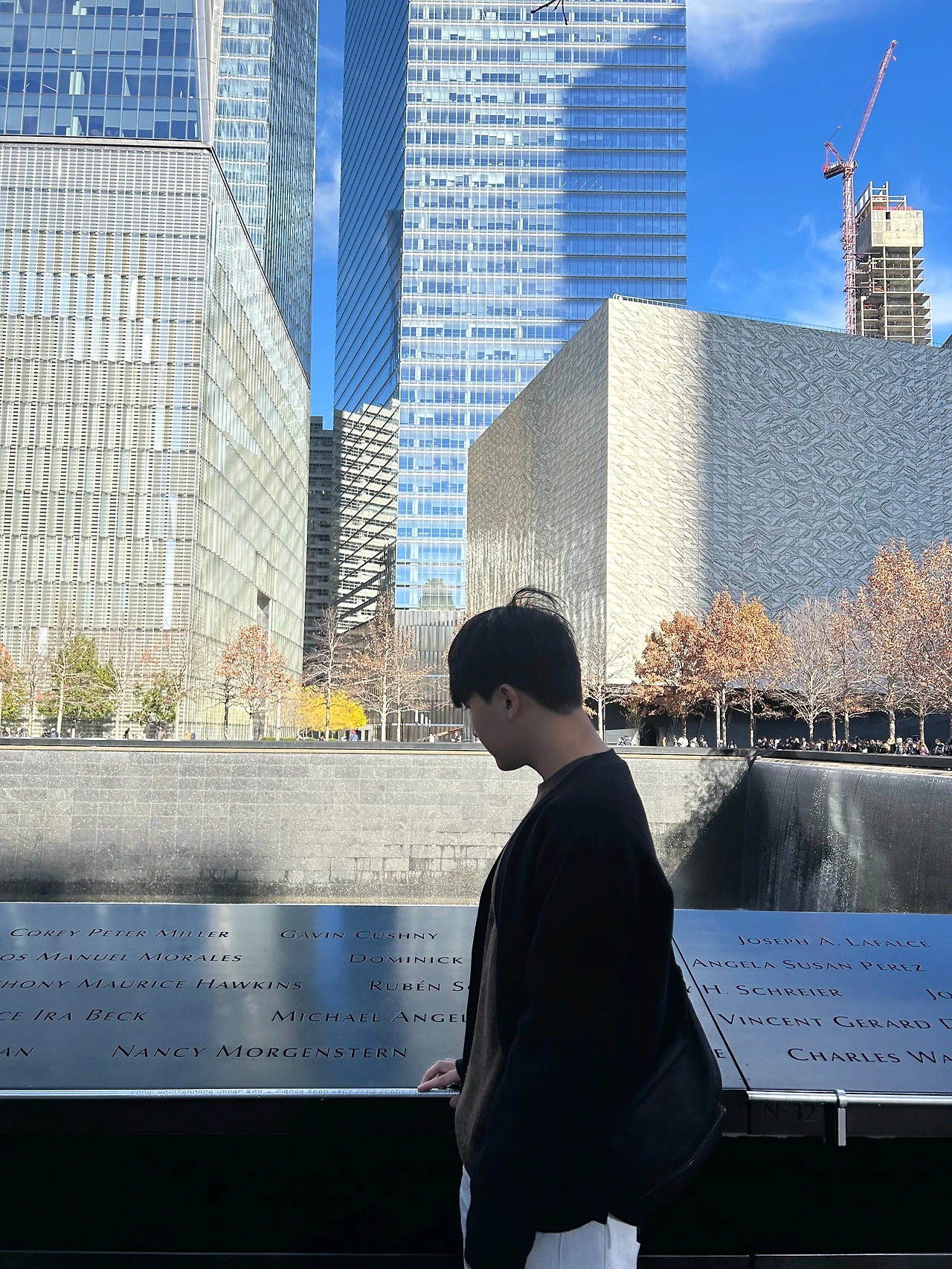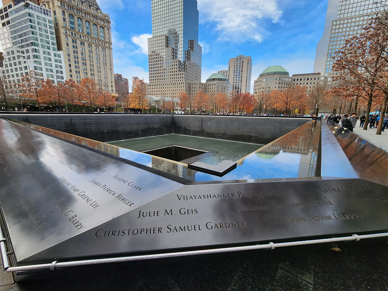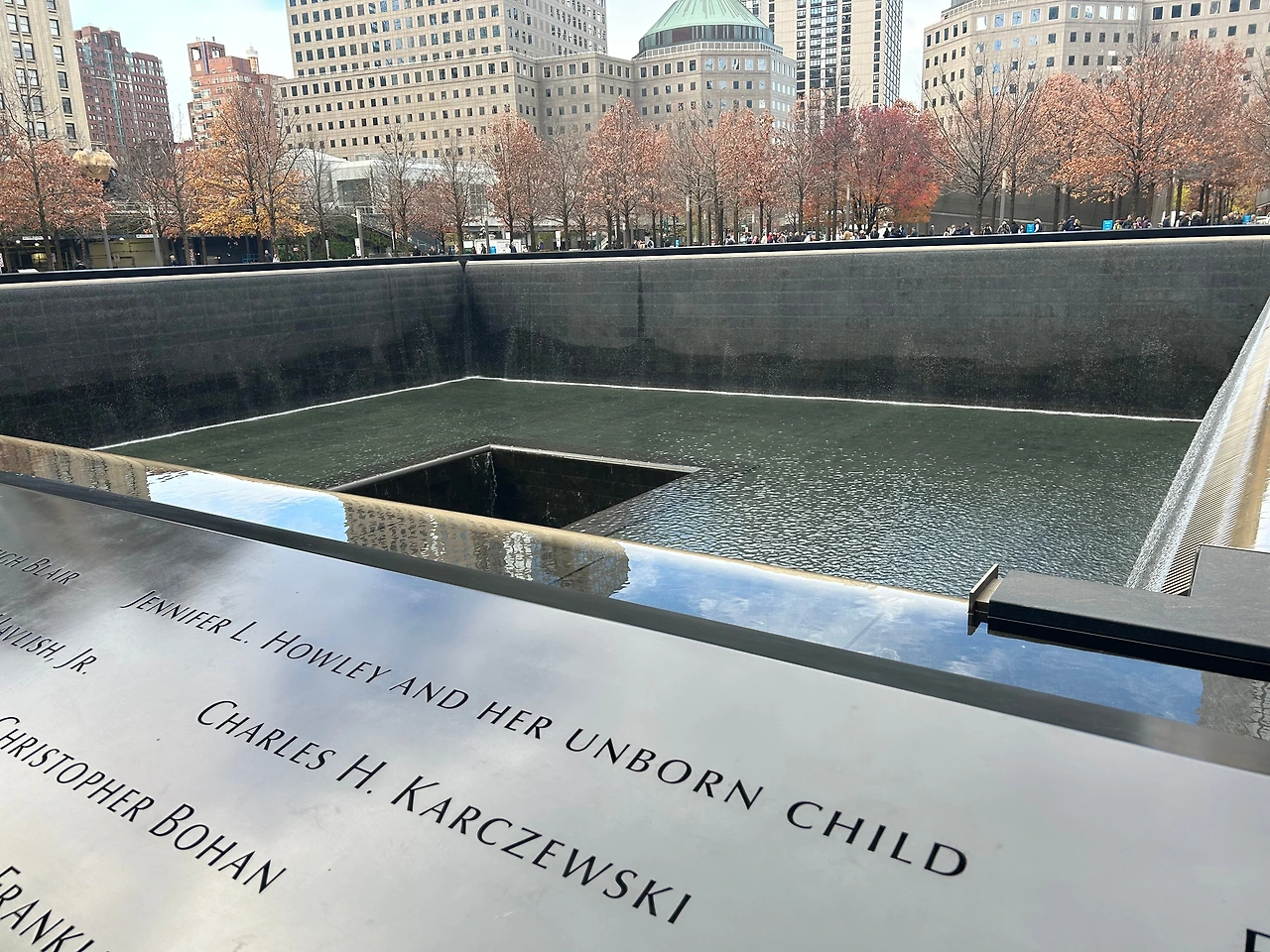 난간 부분에 희생자들의 이름이 씌여 있다. 이 이름을 보며 물이 떨어지는 고요한 소리를 들으면 테러의 슬픔을 온 몸으로 느낄 수 있다. 이 난간에는 이름과 함께 꽃도 있다.