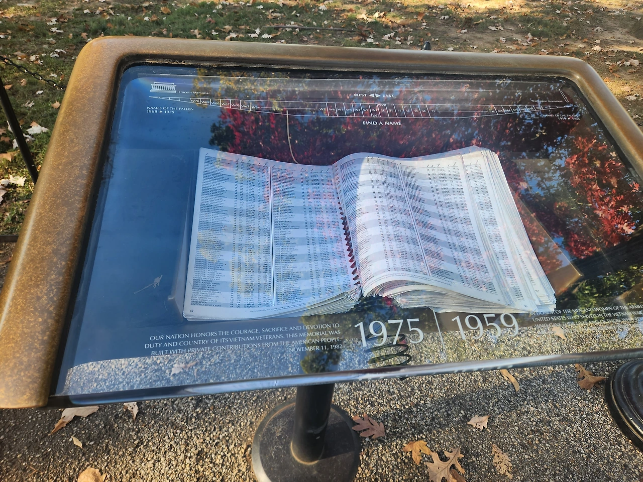 이 책은, 전쟁에서 사망하여 위 메모리얼에 이름이 남겨진 사람들의 지인이, 그 사람의 이름을 찾으려 할 때 이용하는 일종의 사전이다. Davis라는 이름의 페이지를 보면, Davis라는 이름의 수많은 다양한 성을 가진 사람의 이름이 있고, 몇 번째 벽 몇 번째 줄에 이 이름이 있는지 알아볼 수 있다.