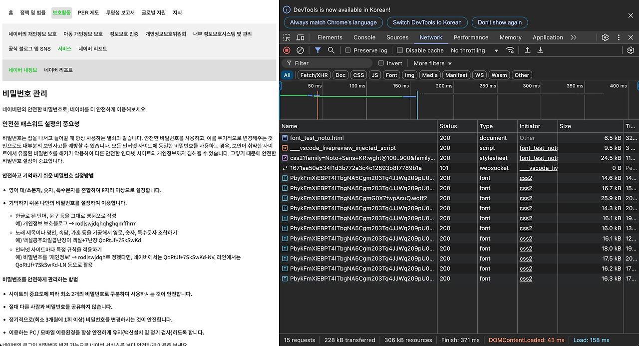네트워크 전송량 기준으로는 노토 산스와 프리텐다드의 가변 다이나믹 서브셋이 가장 가벼웠습니다.