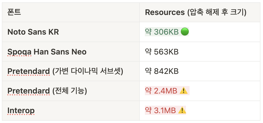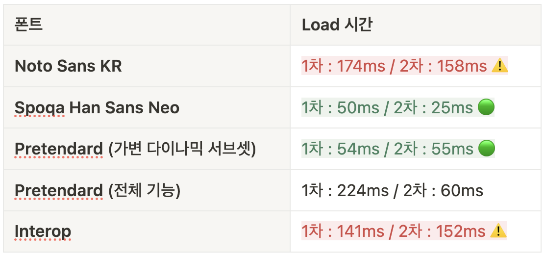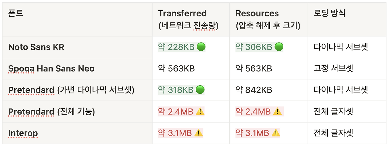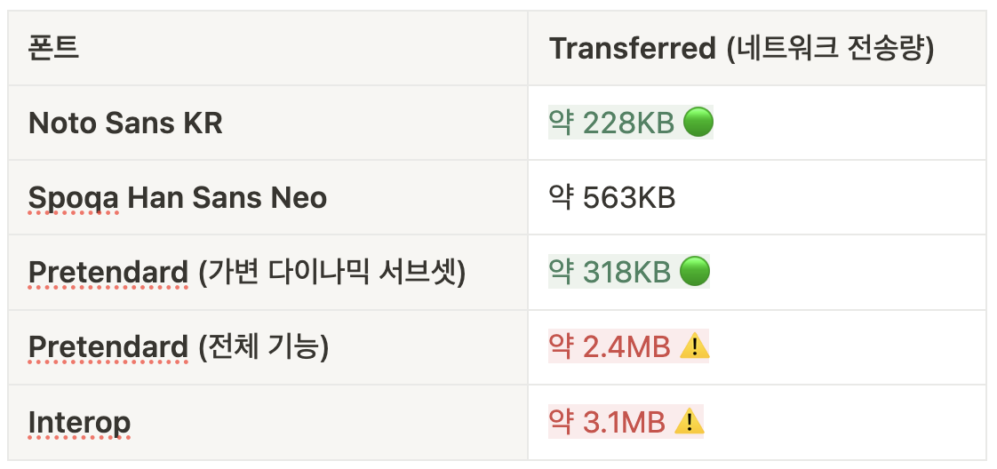 결론적으로, 노토 산스, 스포카, 프리텐다드 다이나믹 서브셋은 성능 면에서 큰 차이가 없어 보입니다. 다만 프리텐다드 전체 기능과 인터롭을 그대로 적용하는 것은 웹 서비스에 적합하지 않을 수 있습니다. 저라면 이 폰트들의 사용을 가급적 지양하거나, 추가 경량화 방안을 모색해볼 것입니다.