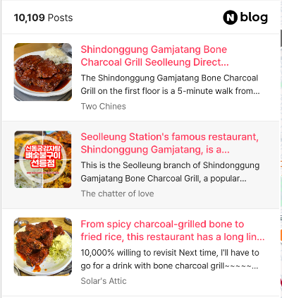 검색된 장소를 클릭하면 중앙 패널에 관련 네이버 블로그 포스팅이 자동으로 검색되어 표시됩니다. 각 포스팅의 대표 이미지, 제목, 요약 내용이 영어로 번역되어 함께 보입니다.