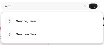 검색창에 "seo"를 입력하면 Gangnam, Apgujeong, Sinsa, Cheongdam 등 서울의 주요 지역명이 자동완성 목록으로 나타납니다.