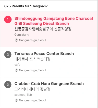 영어로 "Gangnam"을 검색하면 한글로 번역되어 장소 검색이 진행되고, 결과는 다시 영어로 번역되어 목록에 표시됩니다.