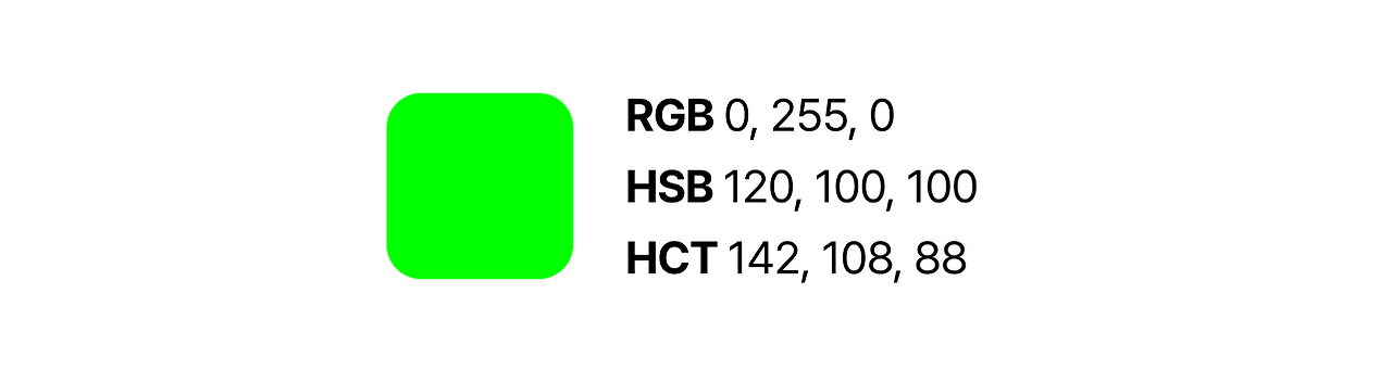 녹색을 RGB, HSB, HCT로 표현하면 다음과 같이 다른 값으로 표현됩니다.
