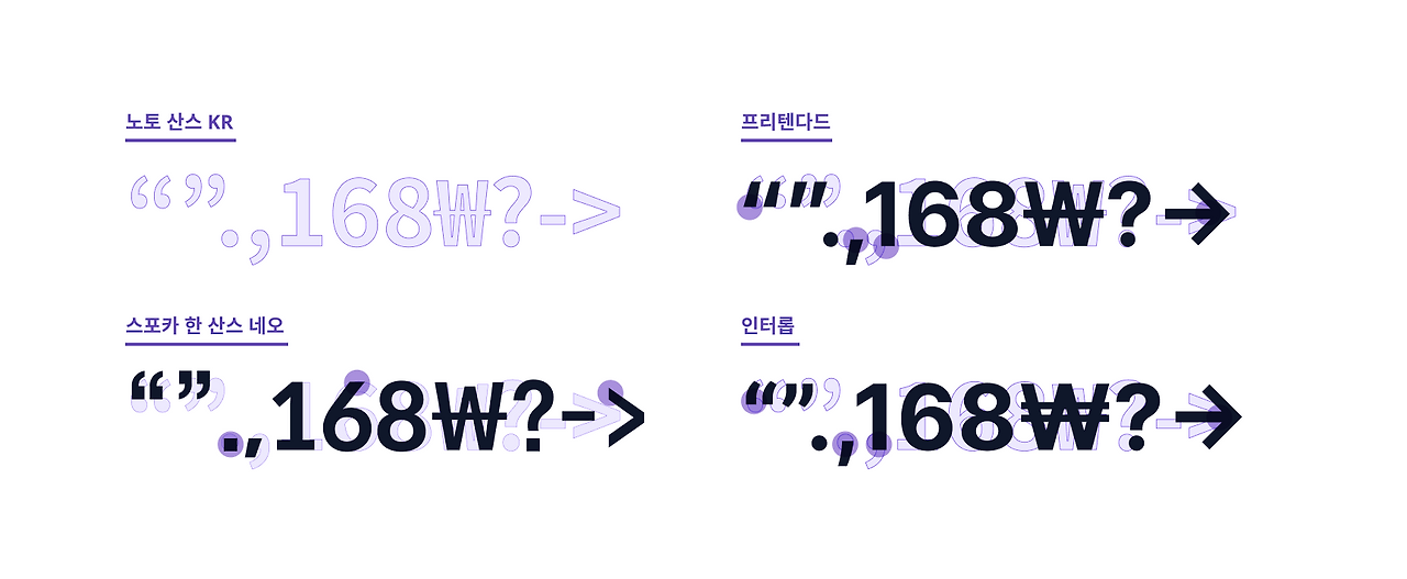 노토 산스 KR, 스포카 한 산스, 프리텐다드, 인터롭 숫자/기호 디자인 비교
