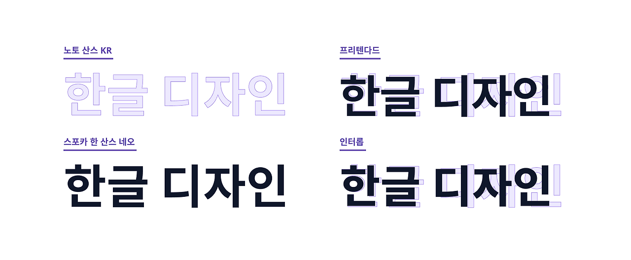 노토 산스 KR, 스포카 한 산스, 프리텐다드, 인터롭 한글 디자인 비교