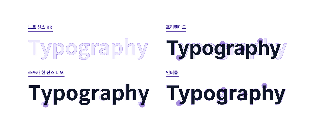 노토 산스 KR, 스포카 한 산스, 프리텐다드, 인터롭 영문 디자인 비교