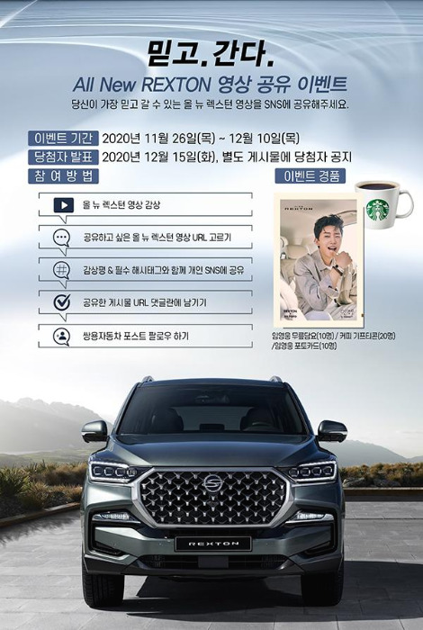 지난 2주간 진행된 ‘믿고. 간다. 올 뉴 렉스턴 CF 공유 이벤트’ 당첨자 발표 많이 기다리셨죠?