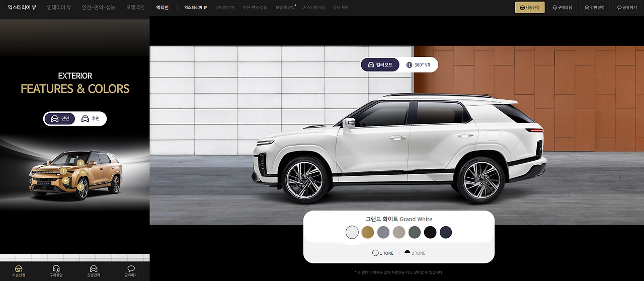 더불어, 제품 소개 페이지에서는 모델별로 통일성 있는 짜임새의 UI를 만날 수 있습니다. ▲익스테리어뷰 ▲인테리어뷰 ▲안전∙편의∙성능 ▲모델 라인업 ▲커스터마이징 ▲상세 제원 등 고객이 찾고자 하는 차량 정보 탐색 기능에 영상과 모션 그래픽 등 시각적 요소를 대폭 늘려, 생동감 있고 몰입감 있는 디지털 체험 요소를 강화했습니다.