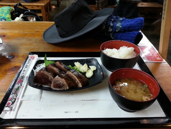 고치 성을 나온 뒤 두번째로 간 곳은 하리마야바시 근처 히로메시장. 여기에 유명한 가츠오다다키가 있다. 여러 음식점이 즐비하게 있고 그 가운데 음식을 먹을 수 있는 식탁이 놓여져 있는 곳으로 꽤 이름이 알려져 있는 곳이다. 입구에 들어서기 직전에 입구 앞에 있는 의류점 가판대에 놓여있는 파란색의 털장갑이 눈에 들어온다. 2,000엔 짜리를 반값으로 판다는 메모 주인과 흥정해서 850엔까지 깎아서 구입.