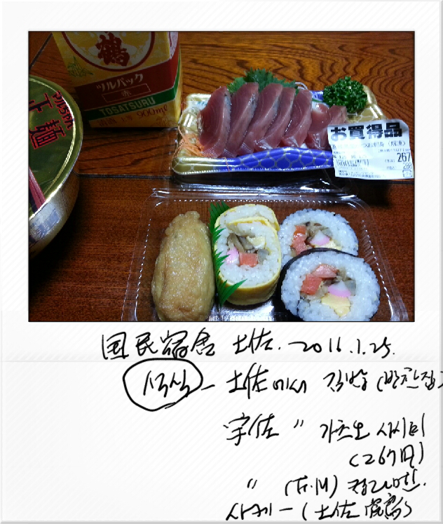저녁 식사거리를 내 놓고 만찬을 즐긴다. 토사 시내에서 산 도시락과 우사에서 산 가츠오사시미, 그리고 33번 절 셋케이지에서 사서 남은 토사츠류 사케로 혼자만의 즐거운 만찬을 즐긴다.