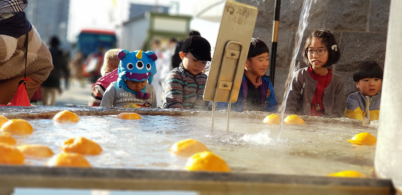 도고 온천 거리. 귤 풍년이다. 귤 족욕하는 아이들이 신났다.